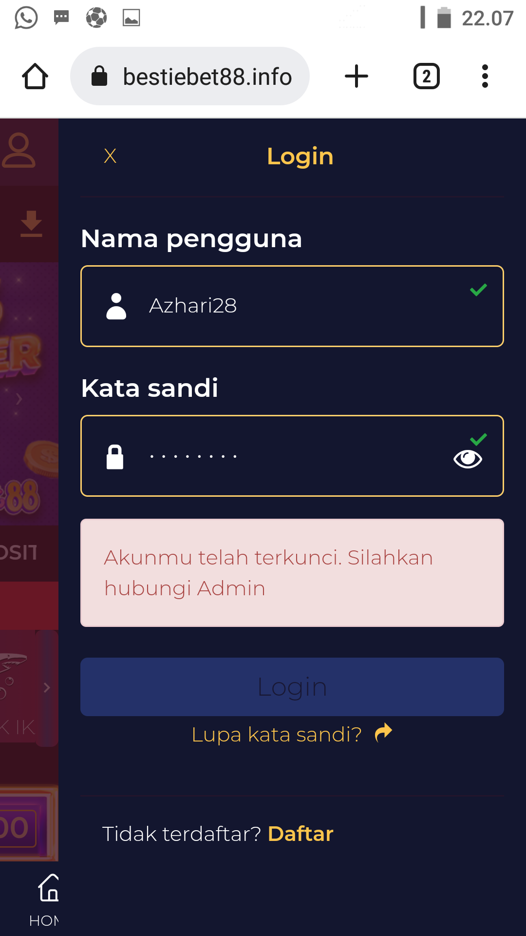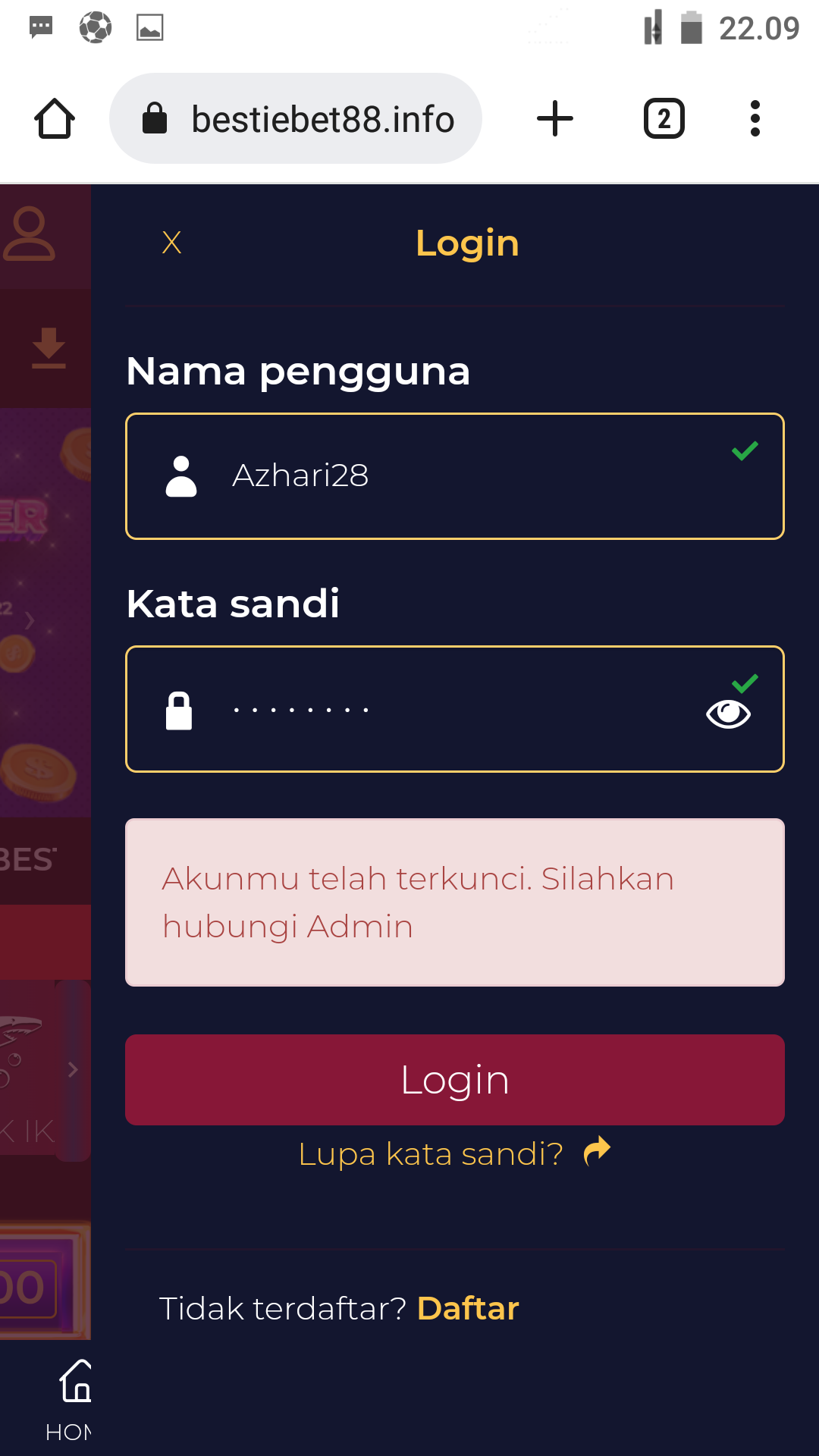 1. maaf baru on apakah akun sobat sudah bisa login itukan sudah diminta data valid akan di bantu reset pasw dari pihak bo