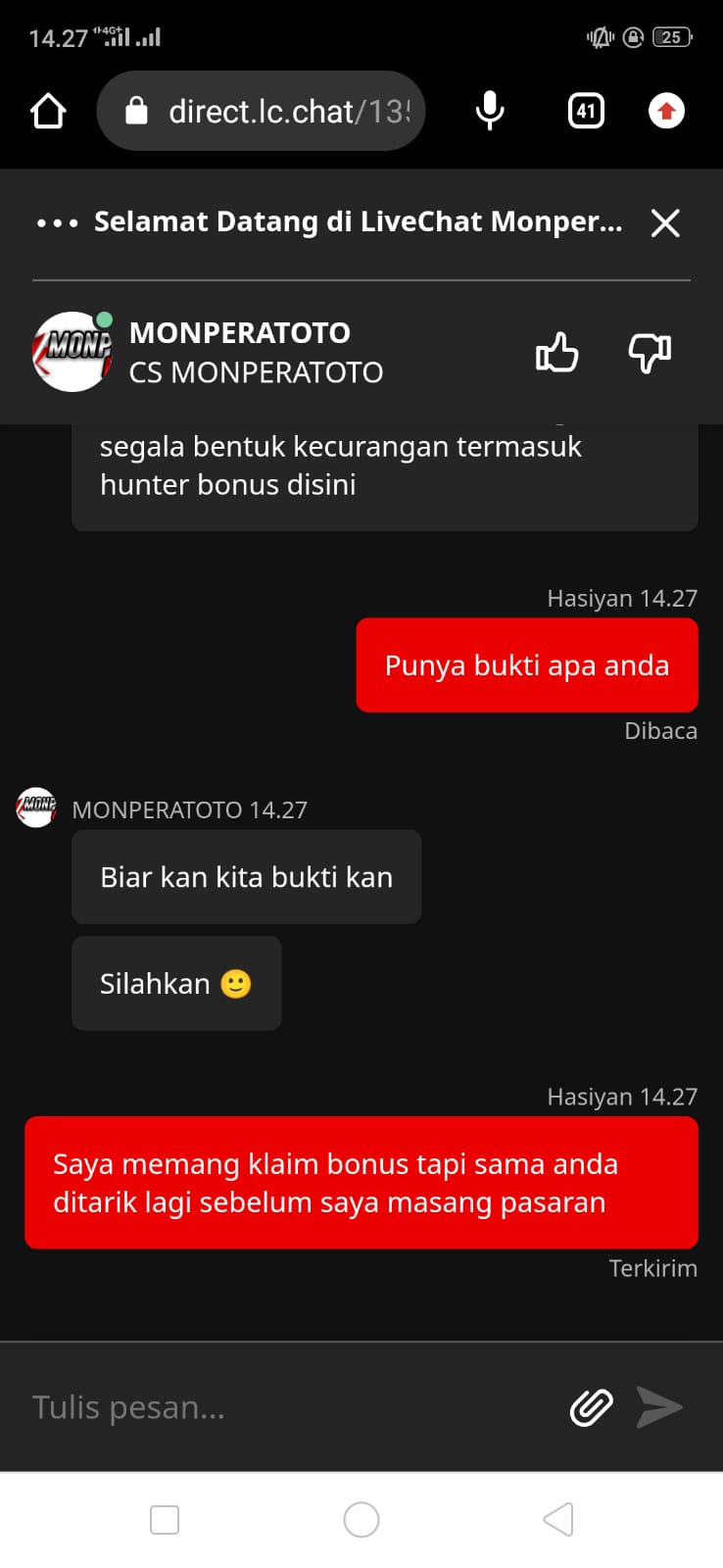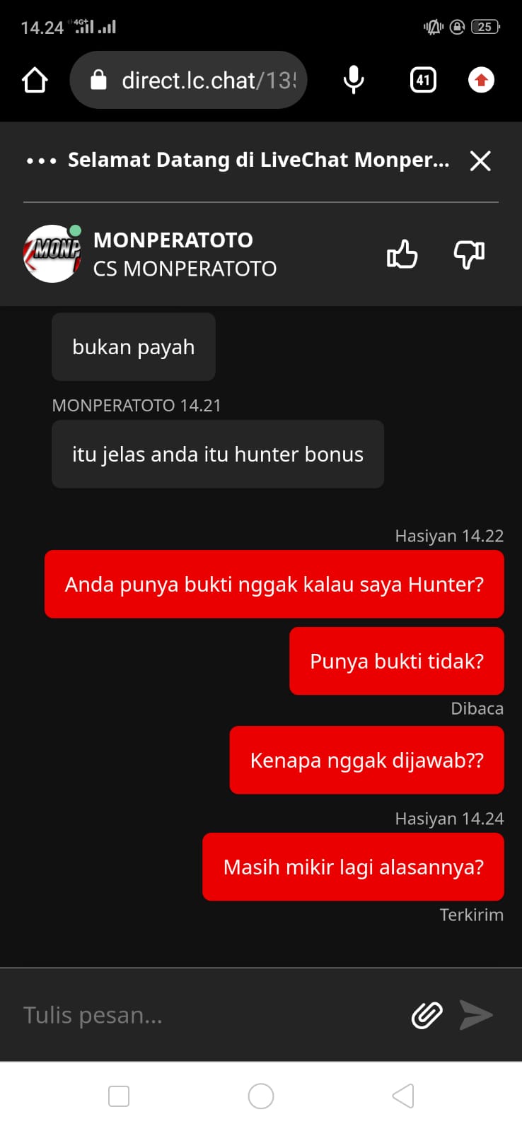 35. Bang saya mau buat laporan, kemenangan saya dipasaran Sydney tidak dibayar sama BO MONPERATOTO alasannya katanya saya pemain Hunter, saya memang klaim bonus tapi bonusnya ditarik lagi dan saya tidak mempermasalahkan, tapi setelah saya JP kemenangan saya malah nggak dibayar