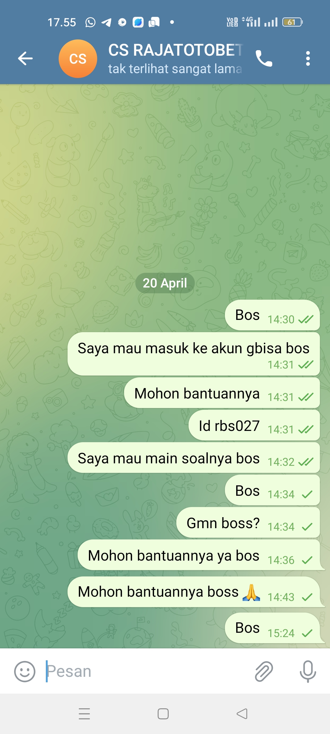 44. Saya menang togel 4,9 jt, saya wd 4,5 jt trus saya mau masuk akun gbisa saya coba wa diread habis itu gadi read lagi, saya coba chat melalui telegram dibales tanya no rekening atas nama sama nomer hp setelah tau akun saya langsung di blok telegram saya