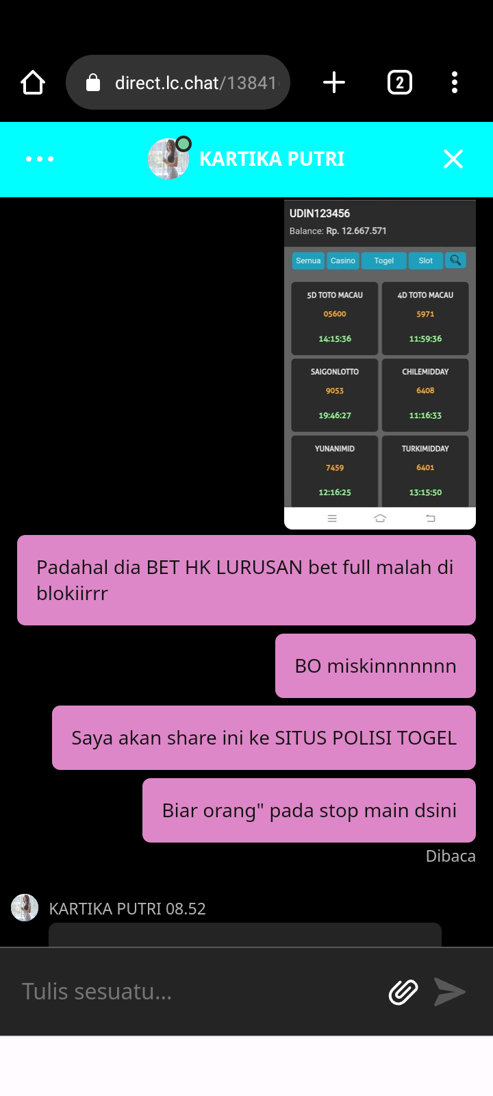 Laporan/keluhan : Hometogel bo terpercaya mulai curang. Betting HK sy tgl 23 juli 2023 masuk 4d dan 3d 5894, akun dan saldo sy diblokir katanya transaksi tidak wajar. Tolong bos richard selidiki. Bo ini dulu rekomendasi bos richard