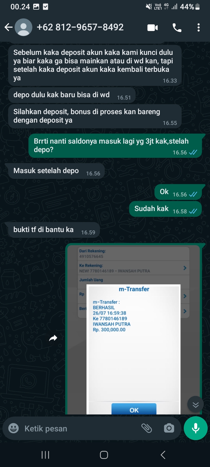 Laporan / Keluhan : WD tidak di bayar dan ID di blokir, Padahal transaksi saya wajar tetapi di bilang BO transaksi saya tidak wajar,, mohon di bantu..