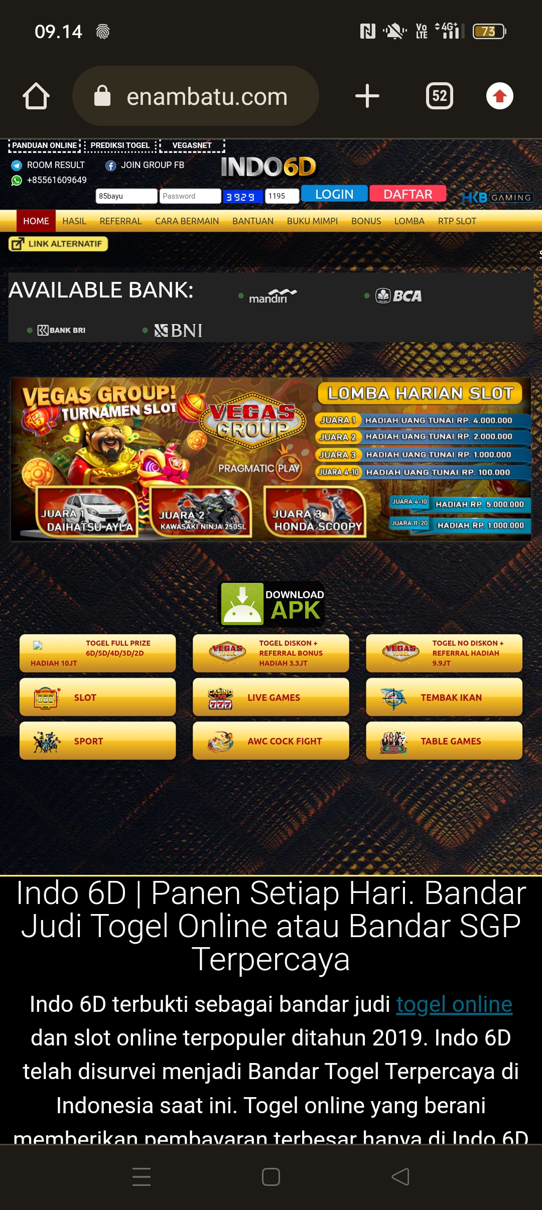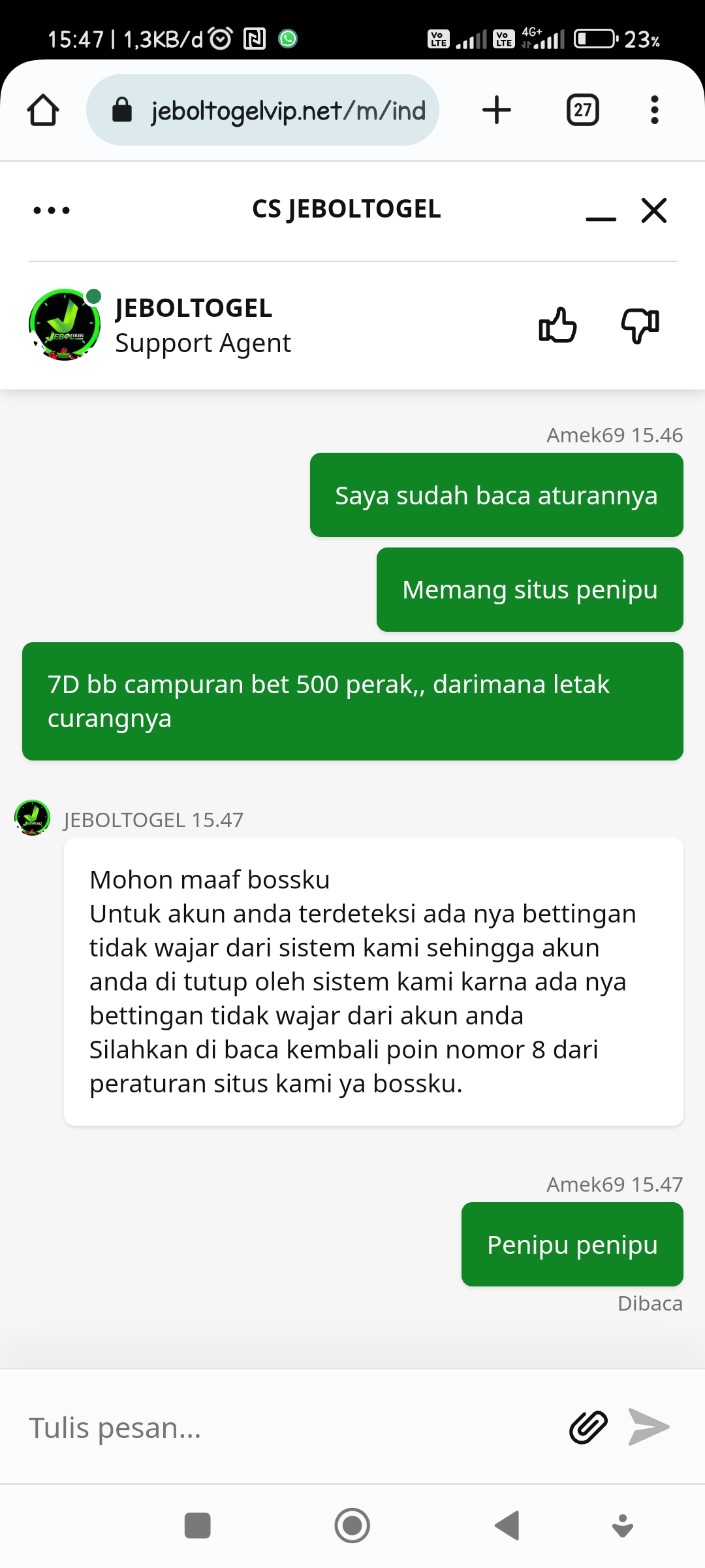 Jp cuma 500 saya wd trnyta dblokir , saya cek menggunakan lupa password akun saya dimanipulatif sama adminnya dia membeli pasaran dngn 1 line seharga jp yg saya wd kan dtanyain adminnya bilangnya tidak tau, ada bbrpa korbannya jp 400/500an lngsng dblokir, kemarin baru ganti situs dari “BJ 4D” sekrang jadi “Jalan Togel” Hati2 buat member yg lain.