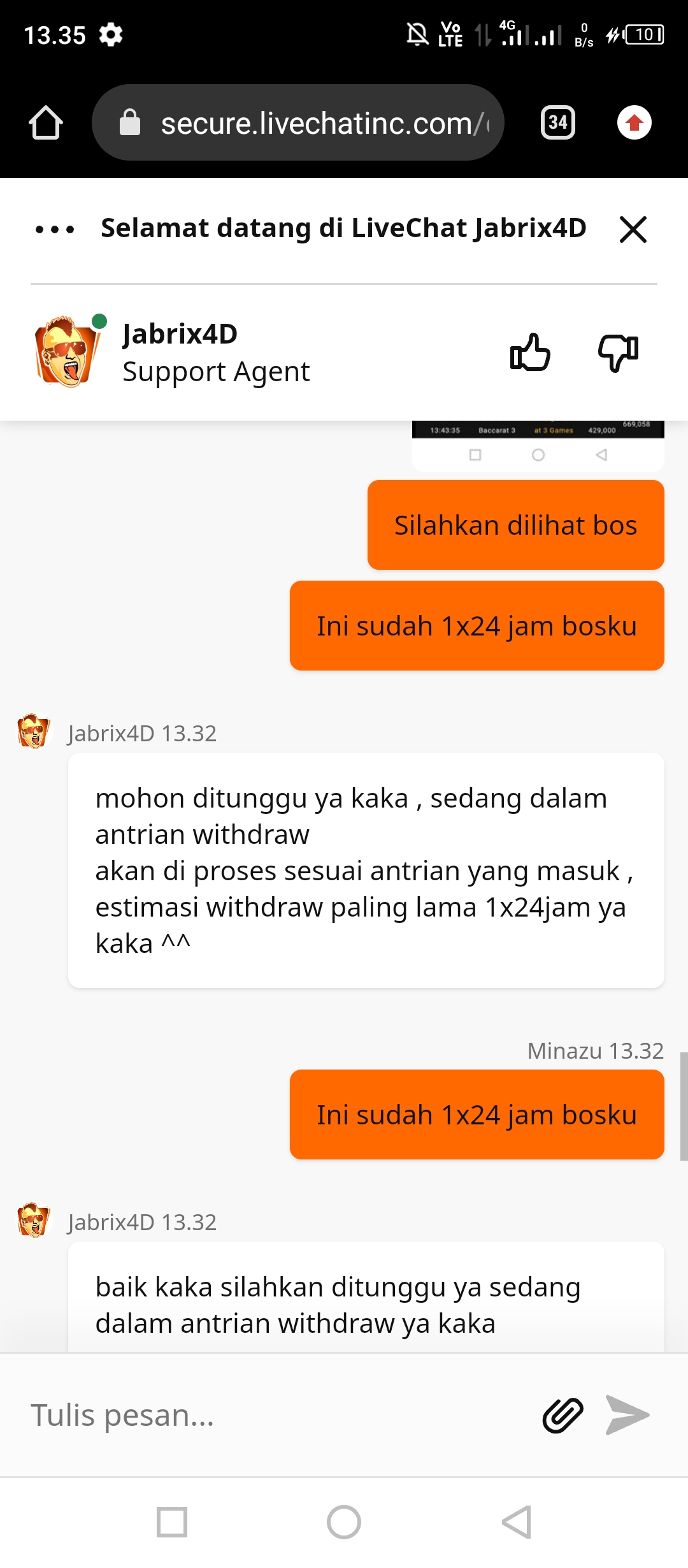 Laporan / Keluhan : WD saya nggak dibayar sama JABRIX4D mereka bilang suruh nunggu 1x24jam tapi setelah 1x24jam WD saya tetep tidak diproses, saya tidak tau alasannya kenapa.