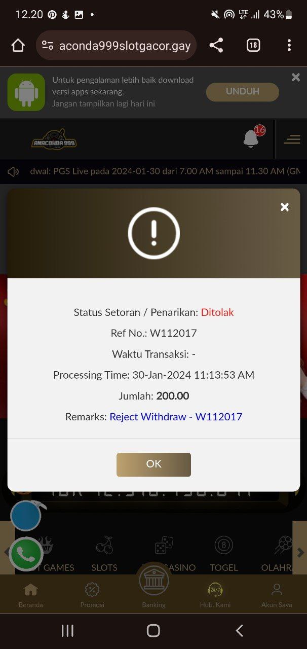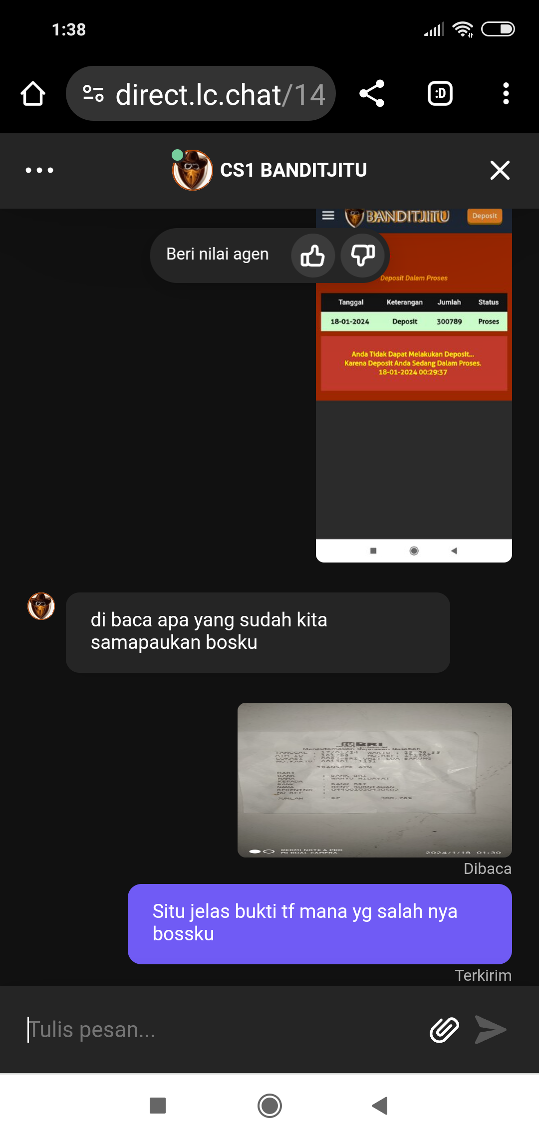 Proses depo tidak di proses alasan tidak masuk masuk dana pdhl sudah di berikan ss langsung
