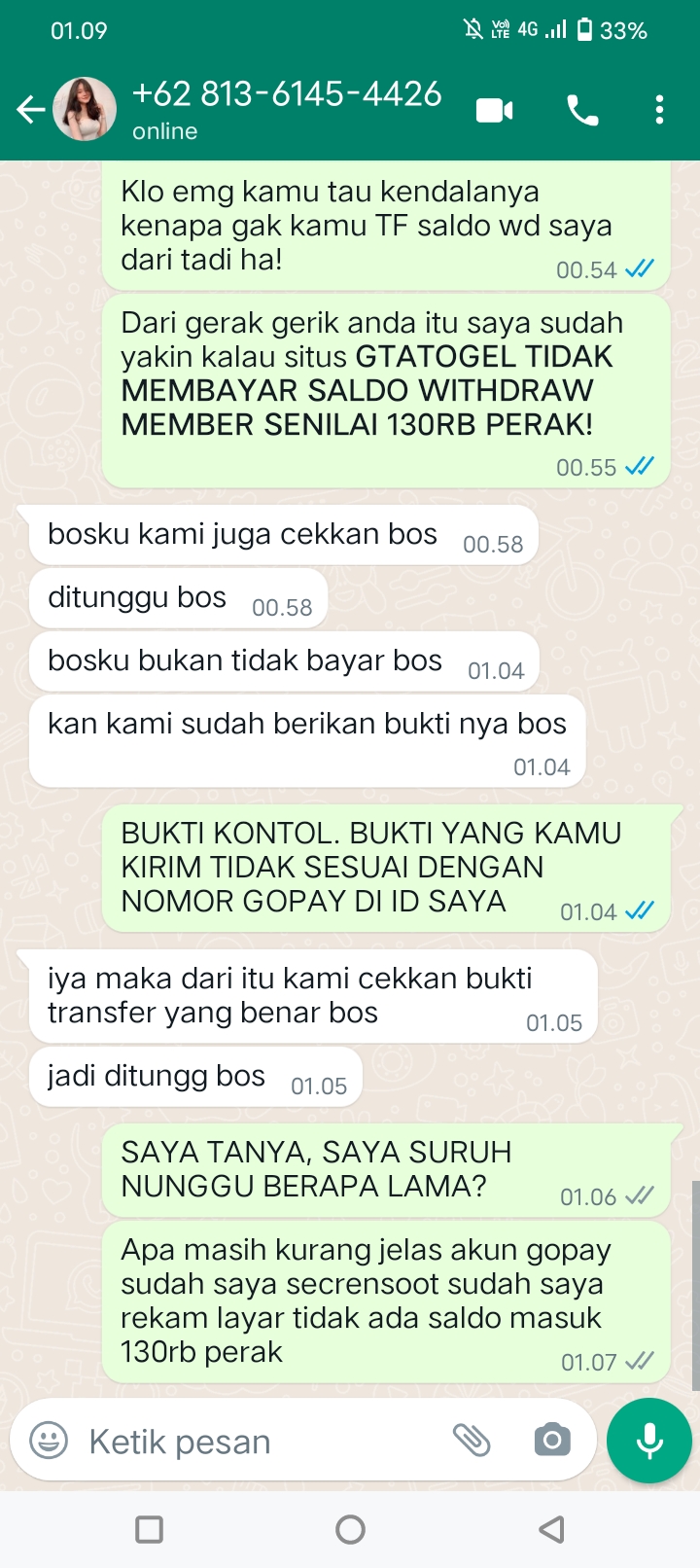 Keluhan : GTATOGEL WITHDRAW RECEH 130RB PERAK TIDAK DI BAYAR SAMPAI DETIK INI PUN, JANGAN MAIN DI GTATOGEL WD RECEH AJA GAK DI BAYAR, GRUP NYA GEDE TAPI SITUSNYA RAMPOK #GTATOGEL