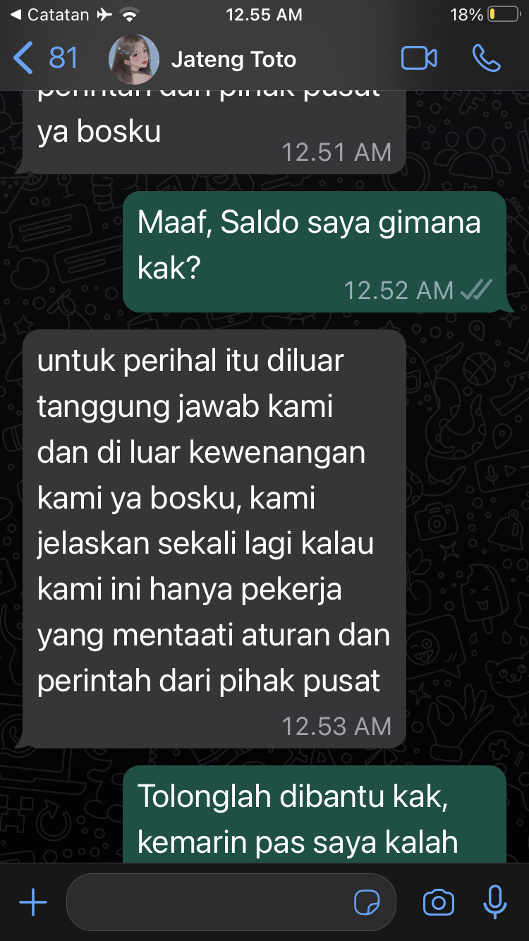 46. Sudah saya chat, tp tetap gak mau keluarin saldo. Dengan alasan dia juga kerja, semua tergantung pusat katanya gitu bang richard. Mungkin bang richard bisa bantu ke admin jatengtoto.