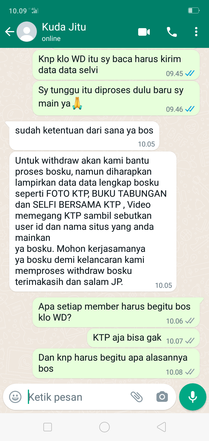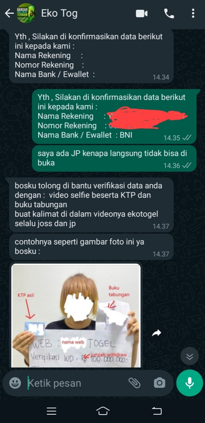 Saat chat ke WA malah minta video memegang KTP asli sama buku rekening sambil bilang Ekotogel Joss gitu