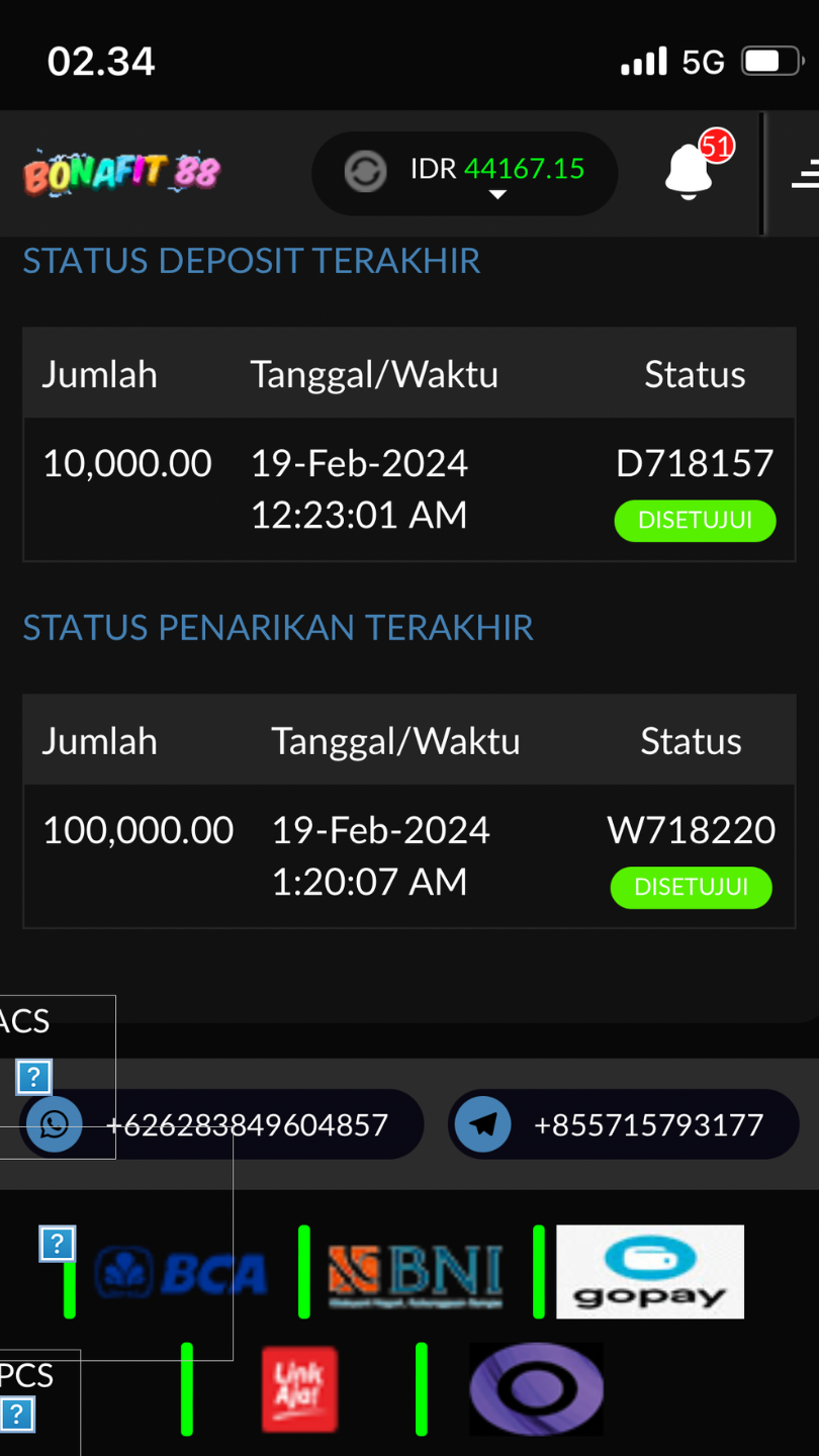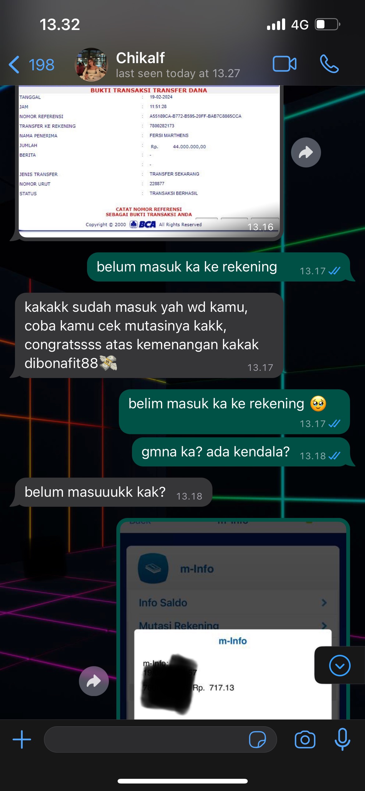 Laporan / Keluhan : main disitus bonafit88 menang 144jt tidak dibayarkan padahal wd cuma 100jt gak semua, malah kirim bukti transfer palsu 100jt sama 40jt blg udah masuk, yg di wd 100jt setelah itu akun disuspen trus dikasih user pengganti tpi gk bisa, katanya gangguan sampe skrg gak masuk2,