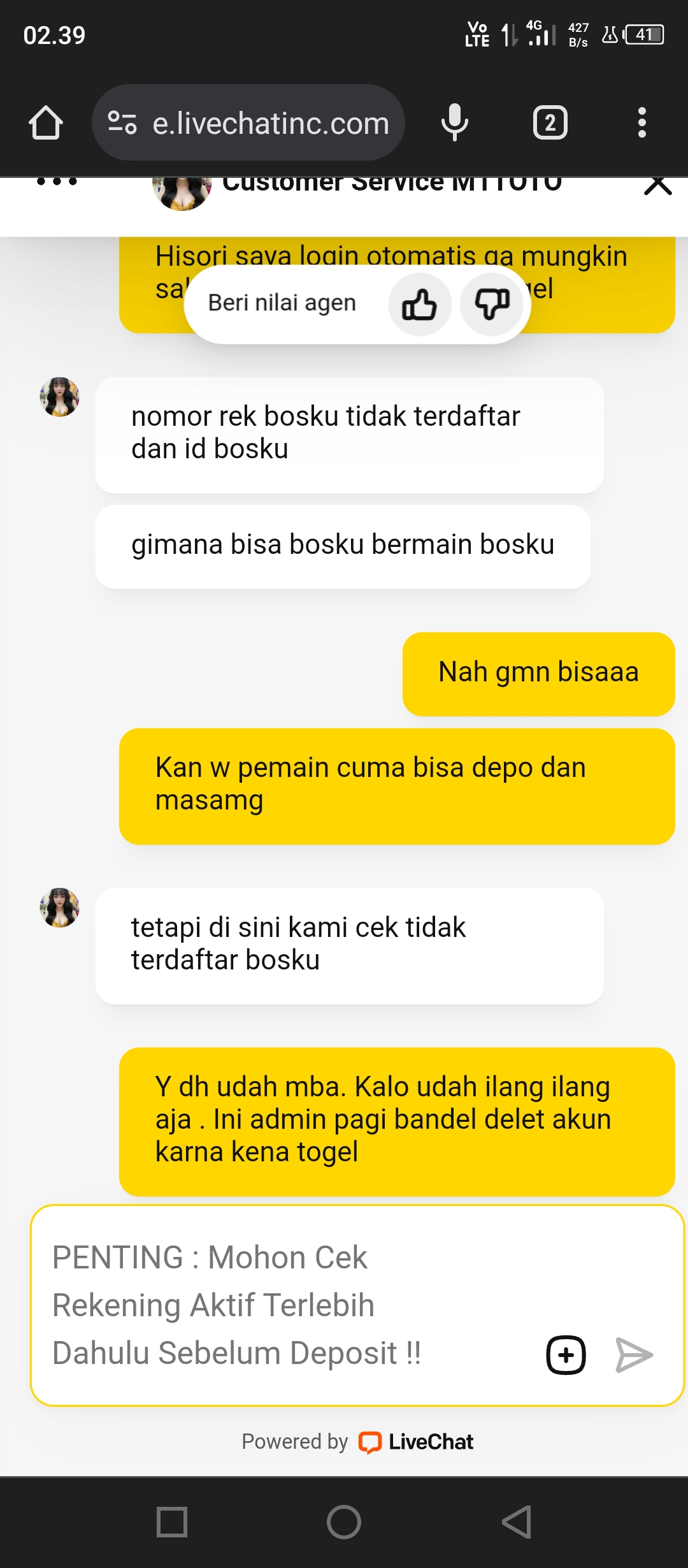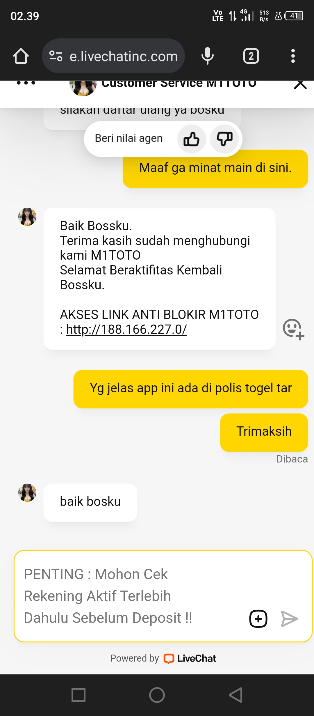 40. Link togel rakyat pas habis depo tidak masuk, lalu chat admin tidak direspon langsung di blockir akunnya.