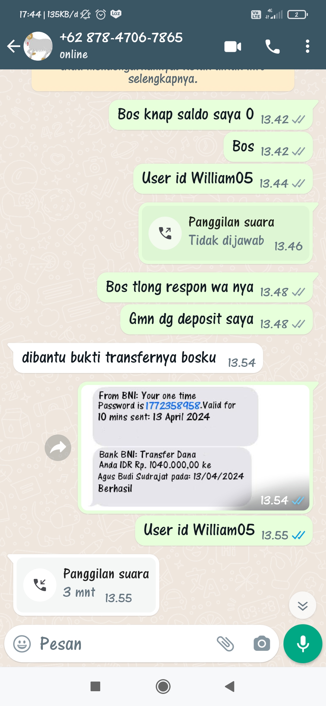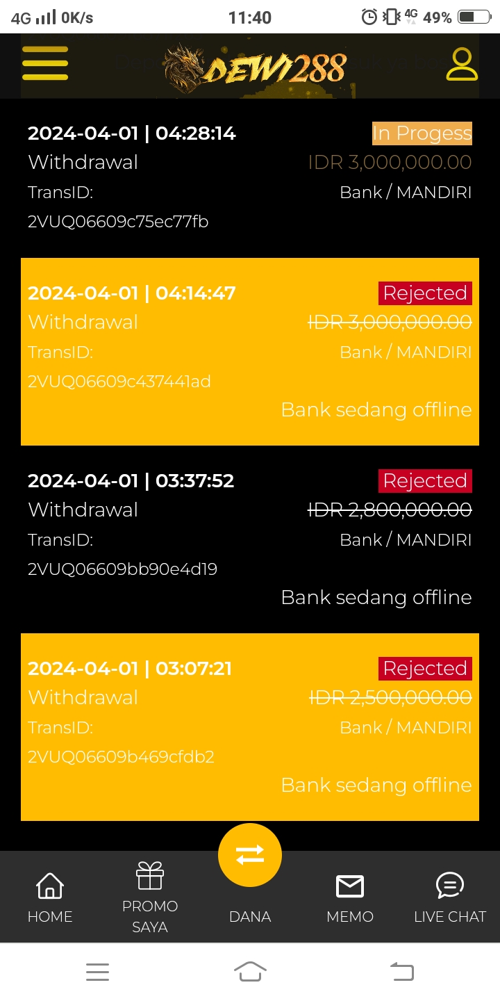 Kemenangan game slot sebesar Rp. 86.000.000, namun dana tidak bisa di Widraw (dari tanggal 06 April 2024 sampai hari ini) dengan berbagai alasan.