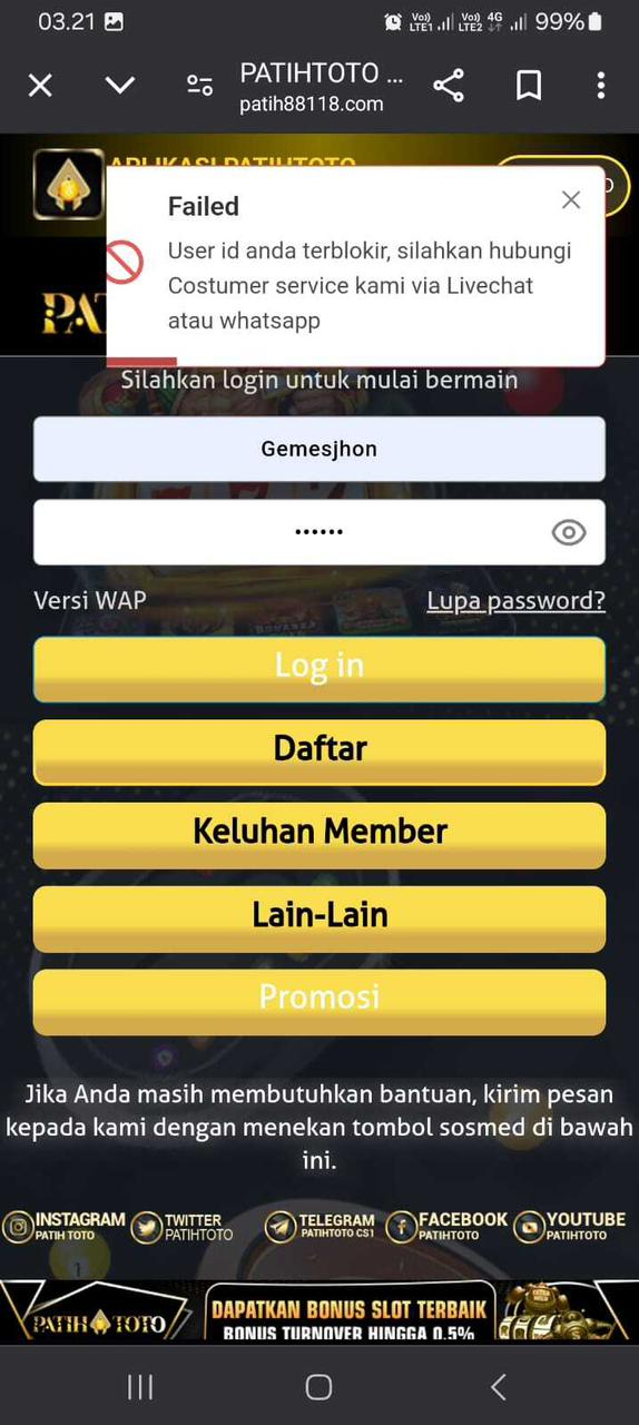 Akun diblokir sistem tanpa ada pemberitahuan, aku tanya kata bettingan tidak wajar padahal bet invest 2d maks 72k, saat itu pasaran mau tutup buru” sy depo tapi gabisa masuk akun cs gamau buka sekedar utk depo langsung wd, sudah komplain ke marketing dan sudah di sampaikan ke admin, sampai sekarang tidak ada info lebih lanjut, hingga komplain lagi ternyata pihak web tidak mau mengembalikan uang deposit, mohon bantuannya ya bos, terimakasih