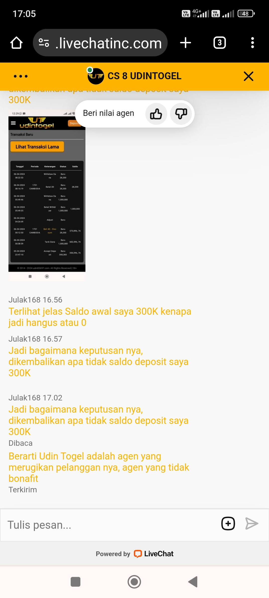 UDIN TOGEL PENIPU!! Saya widdraw 23jt gak dibayar alasan kesalahan sistem dan transaksi tidak wajar