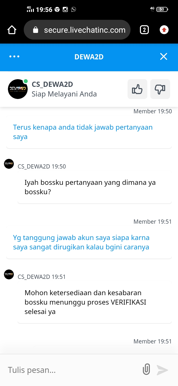 1. Tolong bosku dihubungi situs DEWA2D agar masalah ini segera selesai takutnya semakin lama akun saya tidak ada kejelasan ya bagaimana dan dana di dalam akun saya bagaimana