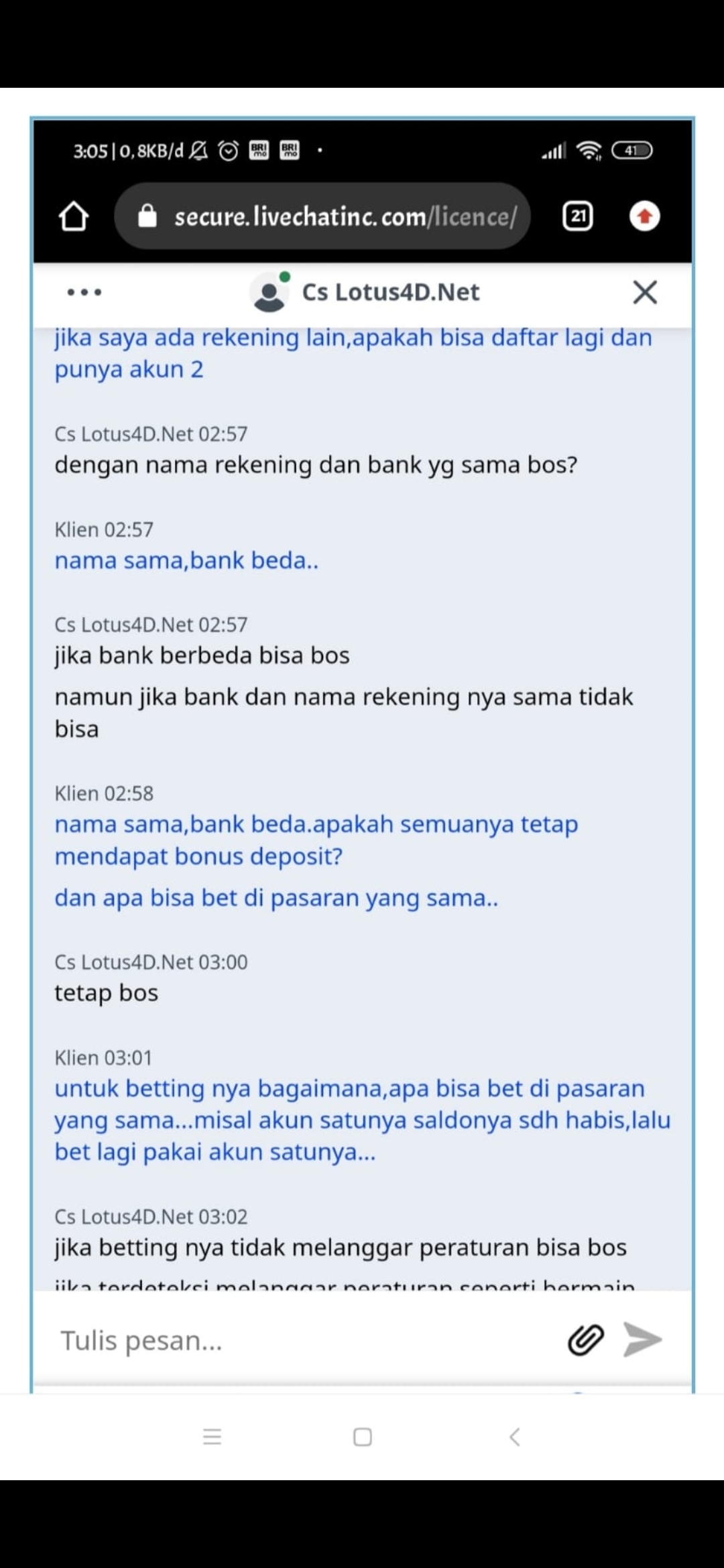 4. saya punya 3 akun,dan sbelum saya buat akun lagi saya sdh konfirmasi dan permisi ke cs nya dan diijinkan bos.jika tdk dijinkan,tdk mgkin saya daftar 3 akun.dan selama ini wd bbrpa kali pun tdk ada masalah.itulah knpa saya berpegang pada ijin dari CS lotus4d tsb..berikut saya share ss percakapan dan bet saya(secara total keseluruhan line selalu dibawah 30 line dari 50 line batas maksimal)