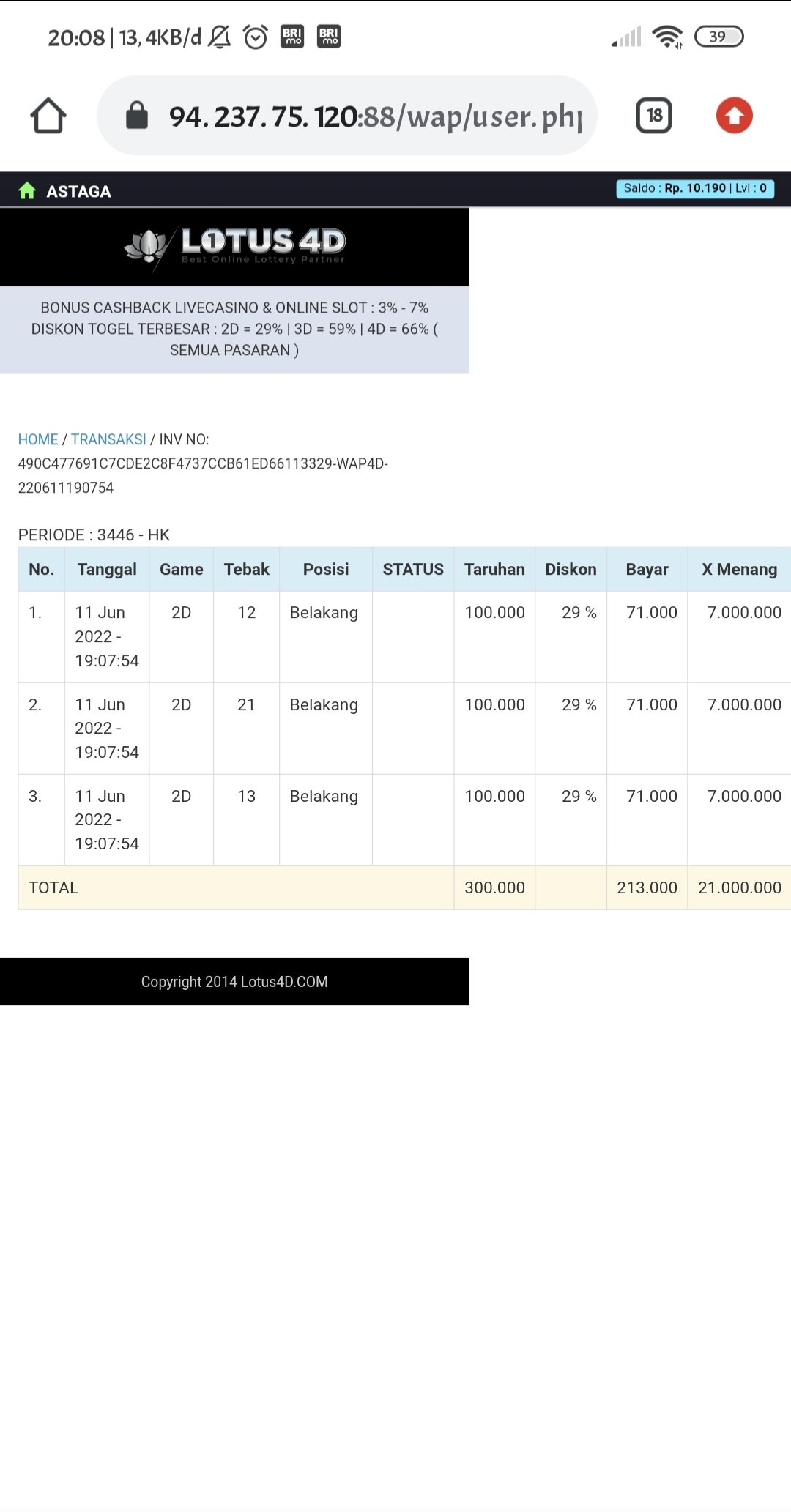 2. bos,pihak lotus4d sampai sekarang blm membayar jp saya 7 juta.dan mengatakan kalau saya bermain banyak id. padahal sbelumnya saya diijinkan pakai 3 akun(ada bukti percakapannya masih saya simpan). dan bet saya jika ditotalpun tidak lebih dari 30 line(di lotus4d maks 50 line).saya bbrpa kali jp pun lancar2 saja dengan 3 akun tsbt sblmnya.oiya bang,saya bd darat juga makanya pakai bbrpa akun…tolong dibantu bang richard🙏