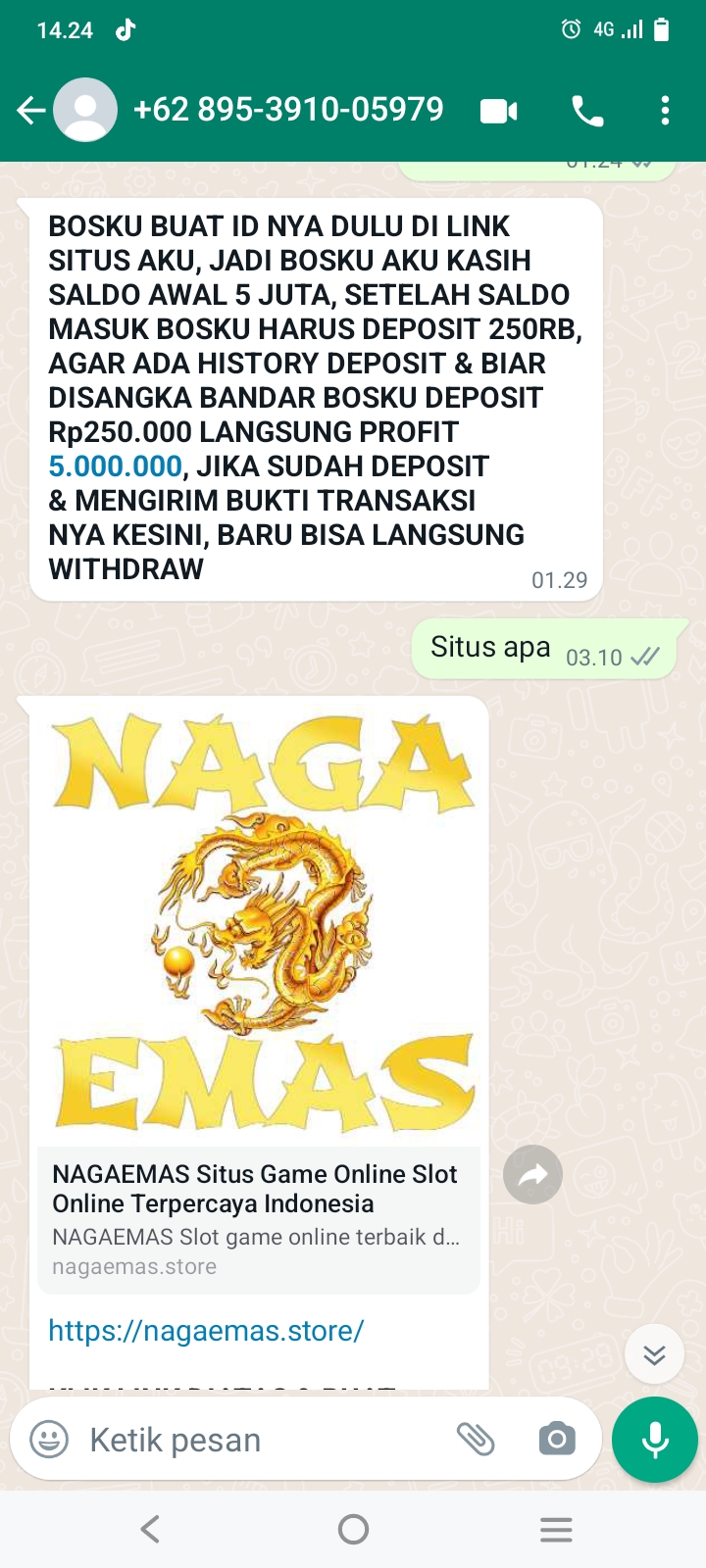 Laporan / Keluhan : bosku apakah bo nagaemas aman karena bonus nya gede banget 5 JT masuk akun kita Trus kita di suruh depo 250rb biar bisa di wd ..makasih bos di tunggu infonya…………….