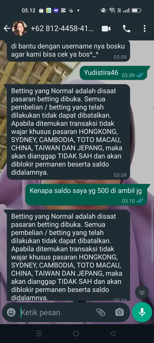 2. Saya menang togel Sidney pembukaan jam 13.51 , kenak 4d x50x5x5, menang 152.350.000 . Mau tarik dana dari semalam alasan tunggu ACC dari atasan , semalam id saya masih bisa dibuka. Hari ini sudah diblokir. Alasan salah sandi. Dikasih sandi sama csnya . Tapi tetap gak bisa buka. Padahal saya sudah bermain begitu lama Uda mau 4tahun saya main selalu kalah. Ini menang malah gak dibayar sama situs layartogel
