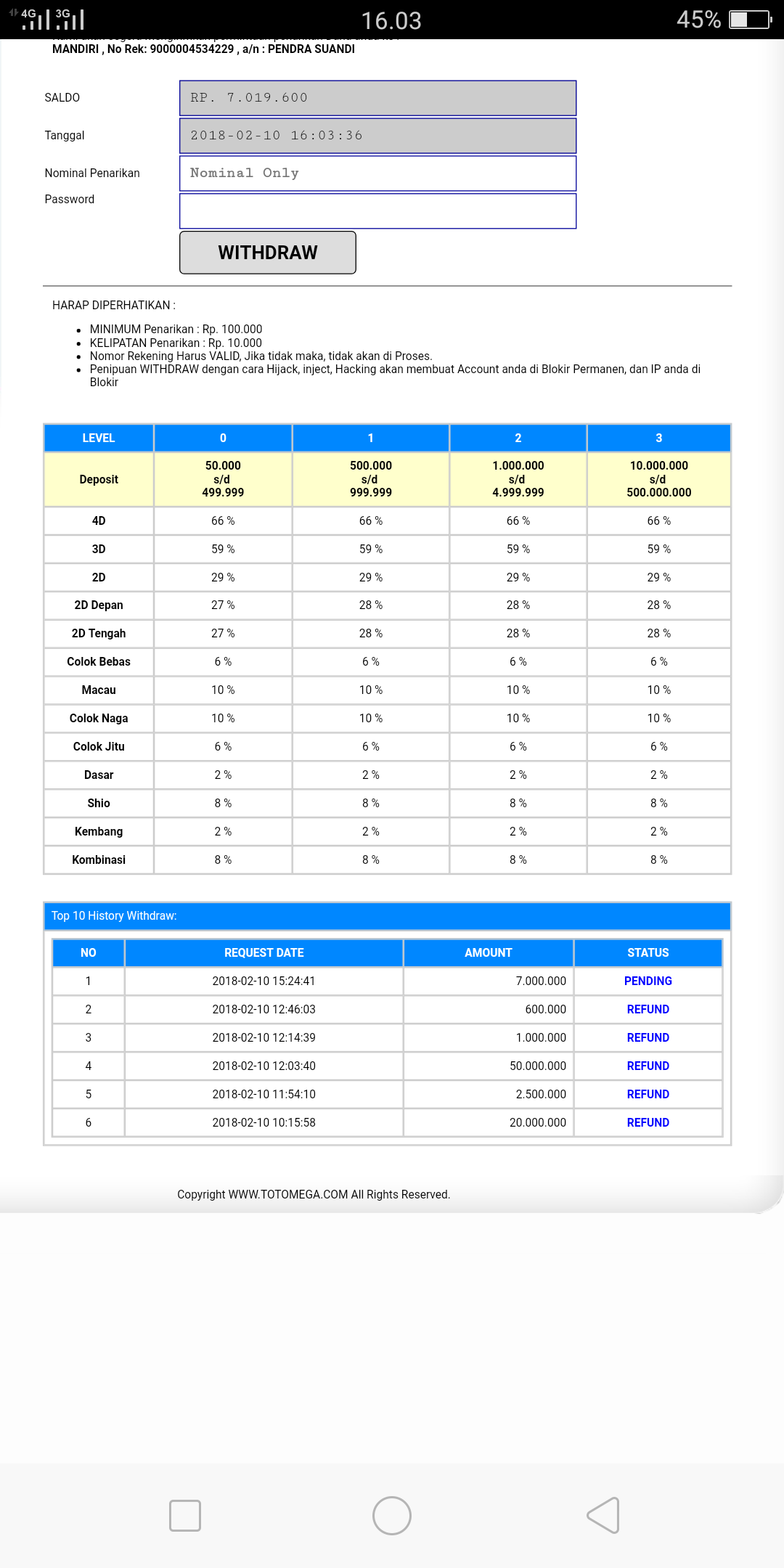 6. SAya belum lama bos kena 470 ribu cuman segitu doang aku tarik dana 250 ribu 3hari gak cair kan totomega brengsek