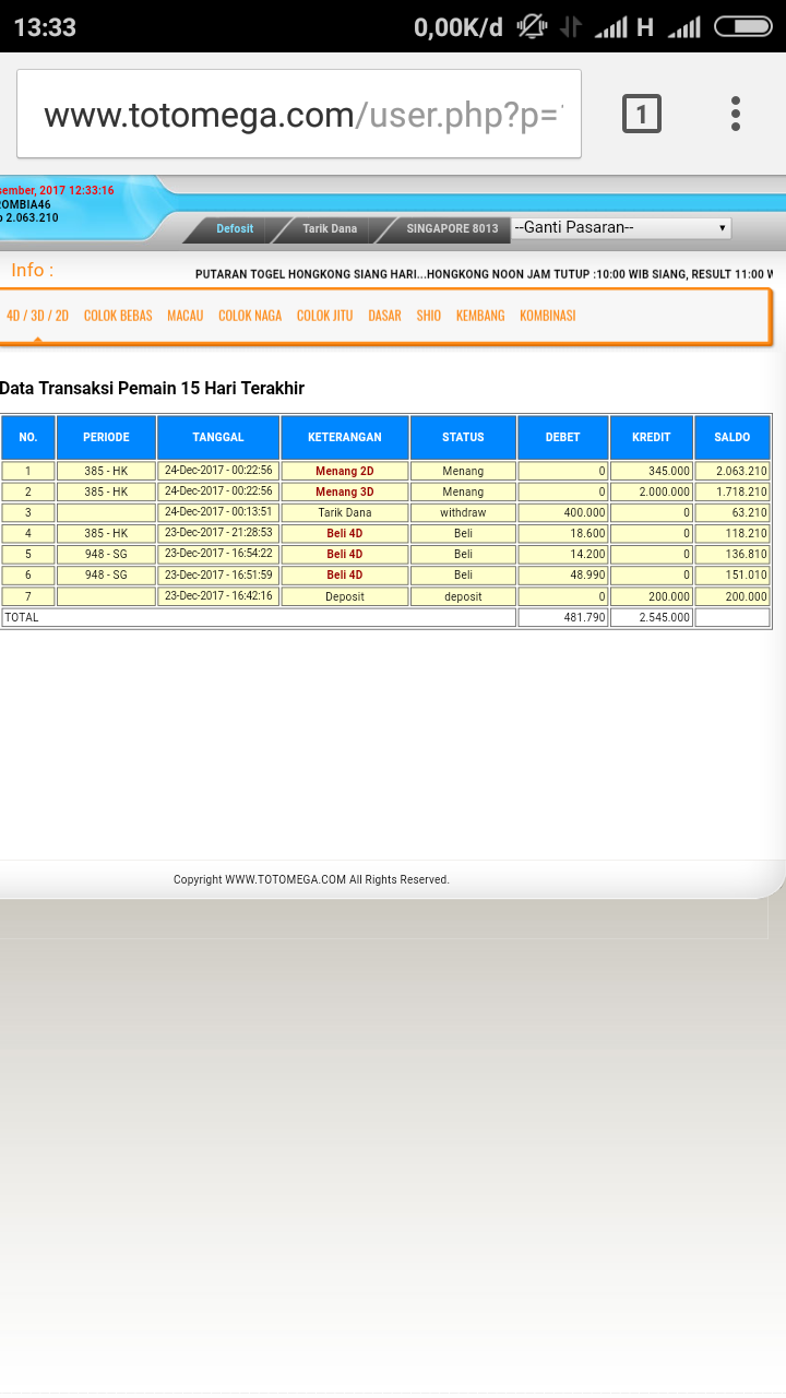 Data Lengkap User Dilindungi oleh polisitogel.info Anda bisa melakukan request Contact / FB User Kepada kami untuk melakukan penulusuran lebih jauh ( berlaku untuk fihak agen togel online Totomega Laporan atau Keluhan ini telah kami juga Repost pada webiste FORUM TOGEL terbesar dan beberapa WebsiteClarifikasi fihak Totomega sangat dibutuhkan jika memang agen togel online tersebut professional dan respoinsive.Untuk Sementara Totomega belum bisa dimasukkan dalam Tabel